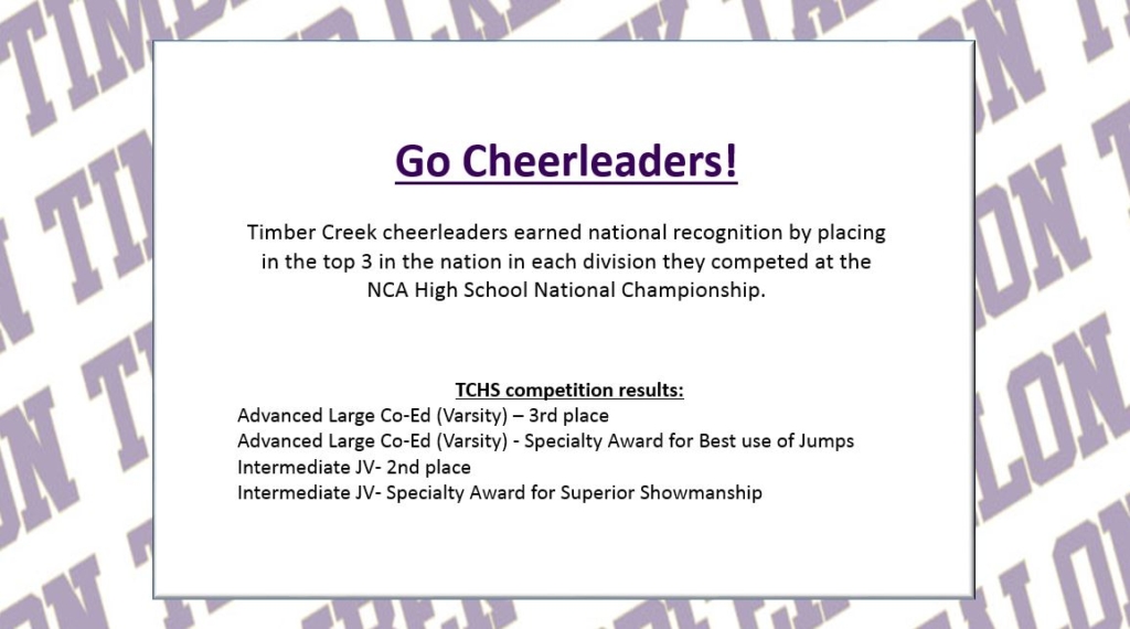 Timber Creek cheerleaders earned national recognition by placing in the top 3 in the nation in each division they competed at the NCA High School National Championship.