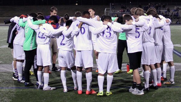Timber Creek varsity boys soccer team huddles up during a Jan. 28, 2015 game. (Photo by The Creek Yearbook photographer Kaitlyn Cass)