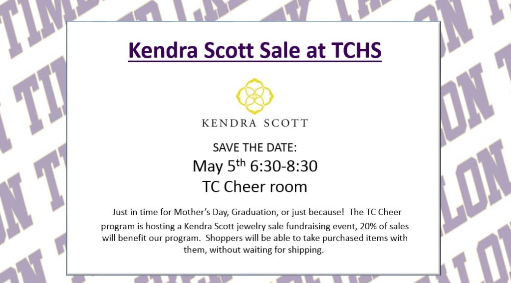 Just in time for Mother’s Day or Graduation, the Timber Creek Cheer program will be hosting a Kendra Scott jewelry sale fundraising event.