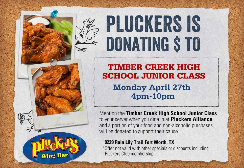 Junior Class Pluckers Fundraiser Set For April 27 April 14, 2015 Timber Creek TalonPluckers in Alliance Town Center is donating to the TCHS Junior class on April 27.The restaurant will donate a portion of food and non-alcoholic purchases to the Class of 2016 from 4 p.m. to 10 p.m.Diners should mention the Timber Creek High School Junior Class to their server.Share this:Click to email this to a friend (Opens in new window)Click to share on Facebook (Opens in new window)Click to print (Opens in new window)Click to share on Twitter (Opens in new window)Click to share on WhatsApp (Opens in new window)Click to share on LinkedIn (Opens in new window)Click to share on Reddit (Opens in new window)Click to share on Tumblr (Opens in new window)Click to share on Telegram (Opens in new window)Click to share on Pinterest (Opens in new window)Click to share on Pocket (Opens in new window)Click to share on Skype (Opens in new window)Other content that might interest you