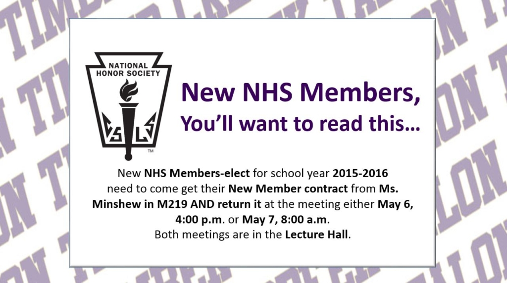 New National Honors Society Members-elect for school year 2015-2016 need to complete their new member contracts and return them before May 7, 2015.