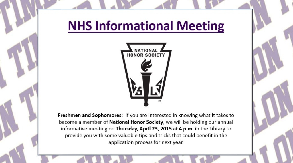 Timber Creek Freshmen and Sophomores that are interested in knowing what it takes to become a member of National Honor Society should attend the annual informative meeting.