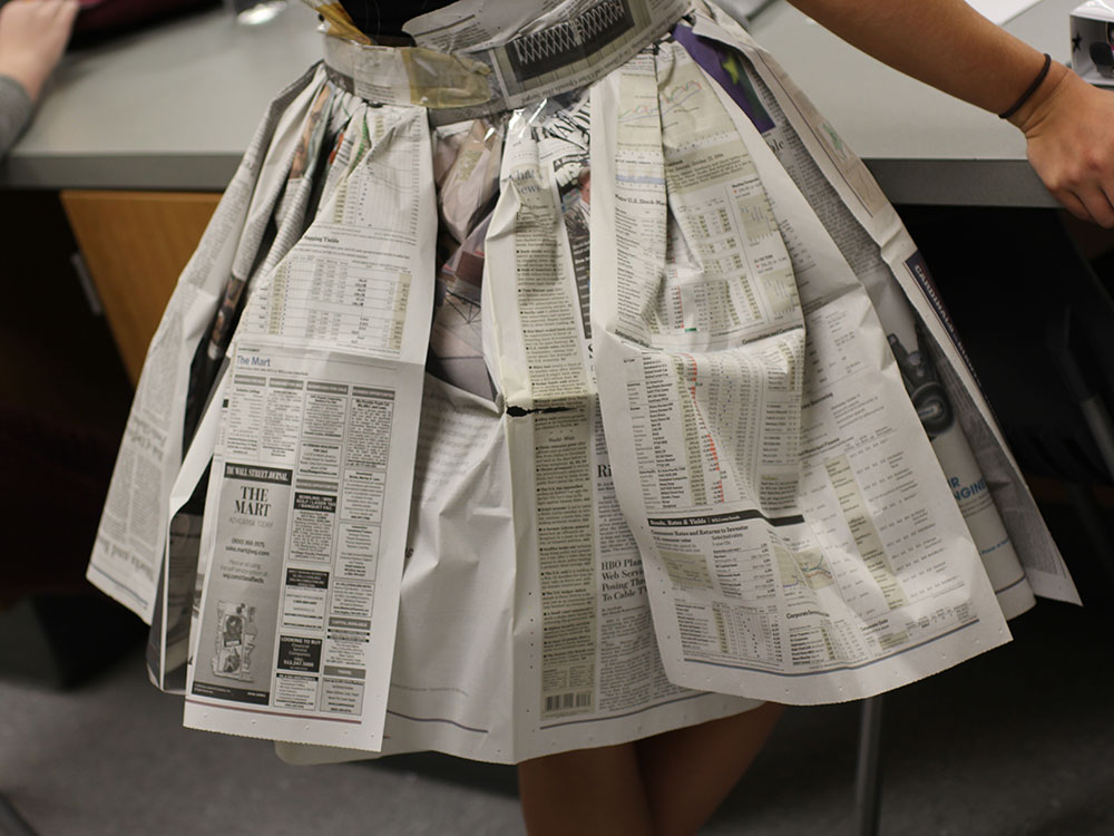 The students were challenged to see useless, discarded objects in a new light. Each group sketched a design and wrote a summary of materials they would use before they constructed the garment. They weren’t allowed to use fabric of any kind and the design had to be within the school dress code.