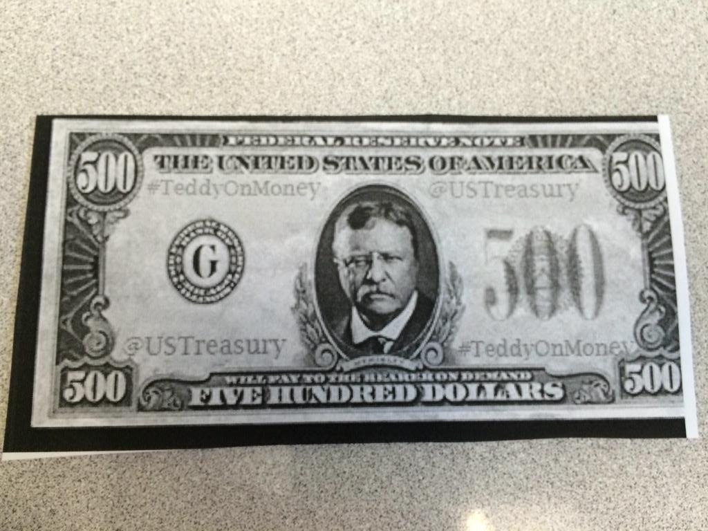 Scattered about the school are model $500 bills bearing the face of President Roosevelt. To support the movement, tweet pictures of the bills with #TeddyOnMoney to the U.S. Treasury.