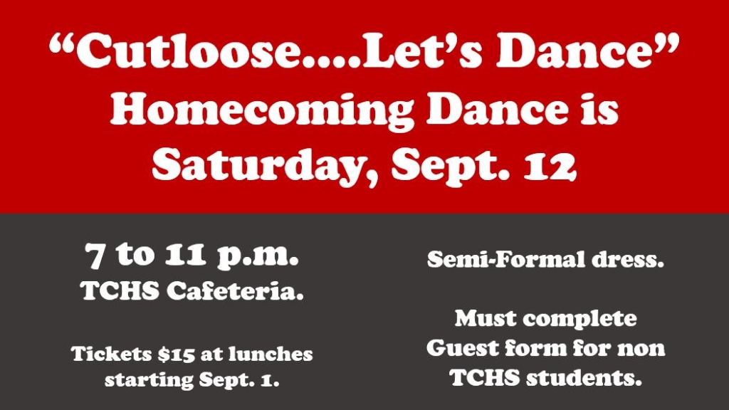 Homecoming tickets and t-shirts will be sold starting Tuesday, Sept. 1 during student lunch times. Tickets are $15 each (presale) and HOCO t-shirts will be available for purchase as well. A limited number of tickets will be available at the door for $20 each. Cash, check, credit/debit cards will be accepted. Checks may be made payable to TC Cheer Boosters.