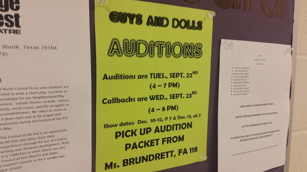 If you’re interested in auditioning, you need to stop by Ms. Brundrett’s room, FA 118 to pick up an audition packet. Fill out the audition packet and bring it with you to auditions on Tuesday.
