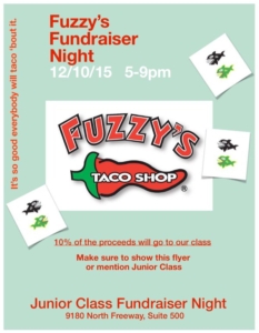 The Junior Class is hosting a spirit night at Fuzzy’s in Alliance on Dec. 10 from 5-9 p.m.