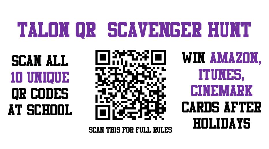 Ten unique codes will be placed around the school by Talon reporters and editors — find all ten and you’re entered in our Grand Prize drawing for a $50 Amazon Gift Card.