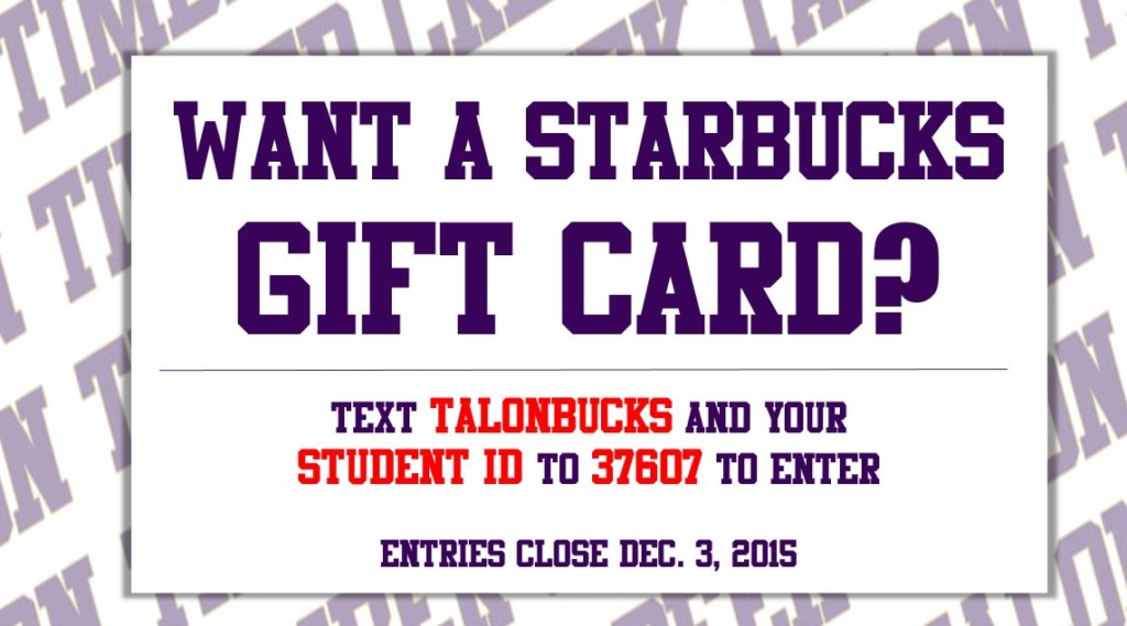 For joining our over 1,900 Twitter followers, we’re giving away two Starbucks gift cards (one $10, one $15) to two Timber Creek students that text TALONBUCKS and their Student ID to 37607 before Dec. 3, 2015.