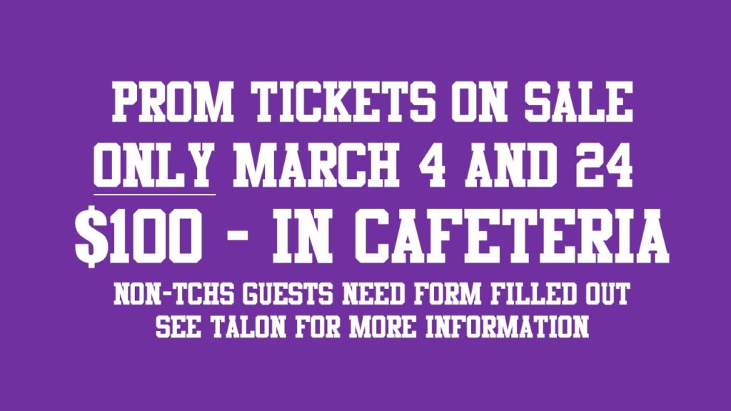 Non TCHS date forms will be made available in the front office beginning Jan. 25. These can be filled out and turned in to Mrs. LeBrun for assistant principal approval prior to purchasing your non-TCHS date’s ticket.