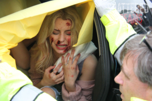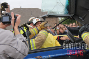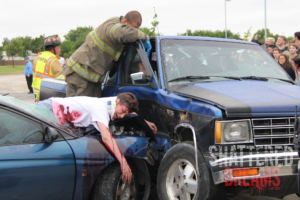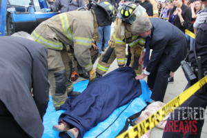 The crash simulated two vehicle colliding at the corner of Funnel Street and High School Road at Timber Creek High School. In the scenario, Hunter Powell was the drunk driver of a vehicle that contained Zoe Ross and Josh Tallman who were coming to school from a “kick back” party the night before. On the way to school, they picked up Gracie Cooper and Sam Schlebach, who were already late while walking to school.