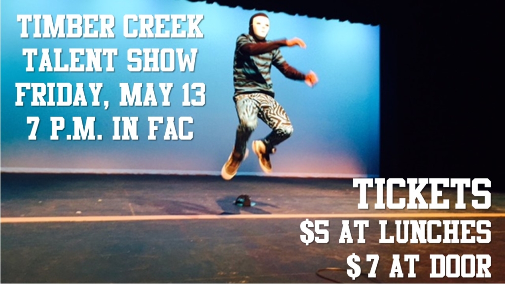 It’s time for Falcon talent to shine — the Timber Creek Talent Show is scheduled for Friday, May 13, 2016 at 7 p.m. in the Fine Arts Center.