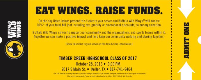 The senior class will be hosting a spirit night at Buffalo Wild Wings this Friday night, Oct. 28, after the football game. Students can pick up a ticket to give to their waiter at the new senior stop bulletin board, located downstairs North Hall by the staircase.