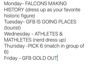 The week of Nov. 14-18 is a dress up week in support of the Falcon Football team making the second round of Playoffs.