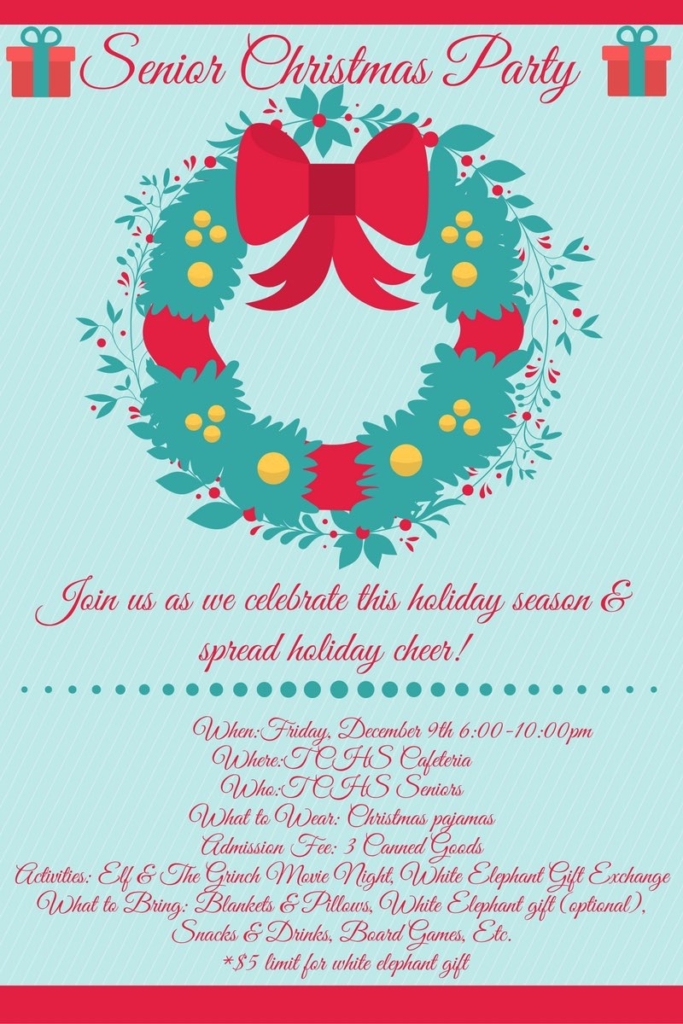 The 2017 senior class is holding a “Senior Christmas Party” on Friday, Dec. 9 from 6 p.m. to 9 p.m. in the TCHS cafeteria.