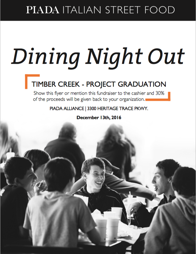 Timber Creek High School Project Graduation is working together with the 2017 graduating class to participate in a food drive event to benefit the Community Storehouse on Dec. 13, 2016. They will be hosting a Dining Night Out event at Piada in Alliance, which will be donating 30 percent of the proceeds to Project Graduation. Each food item donated by a senior will earn them one additional raffle ticket for Project Graduation. The more food items donated the more tickets you can earn.