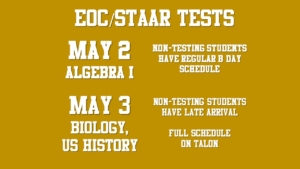 Timber Creek students have two EOC/STAAR days scheduled in early May, but each day is a little unique. Read on for full details on the schedule, locations, and if you can actually read after the tests…