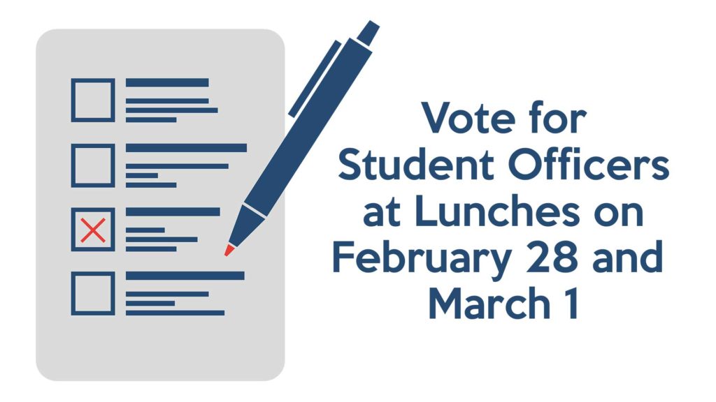 Elections for Student Officers will be held during lunches on Tuesday, February 28 and Wednesday, March 1, 2017.