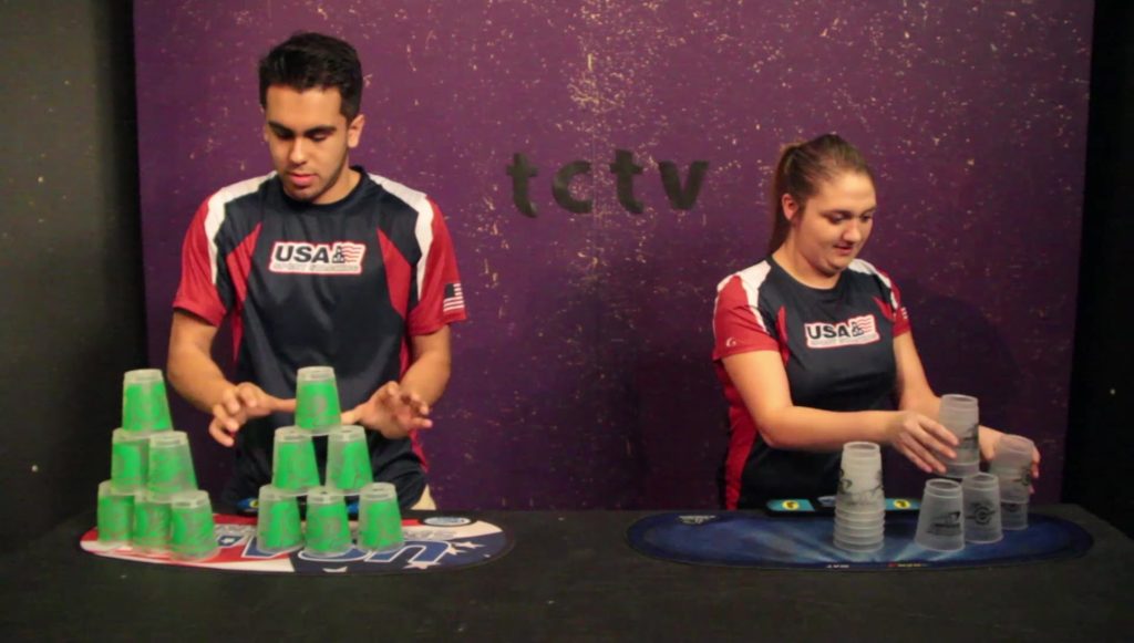 Working to build a seemingly tower of cups in a specific sequence by using numerous algorithms, sport stacking is an individual or team sport in which Griffith and Michilizzi compete for their fastest time in an event.