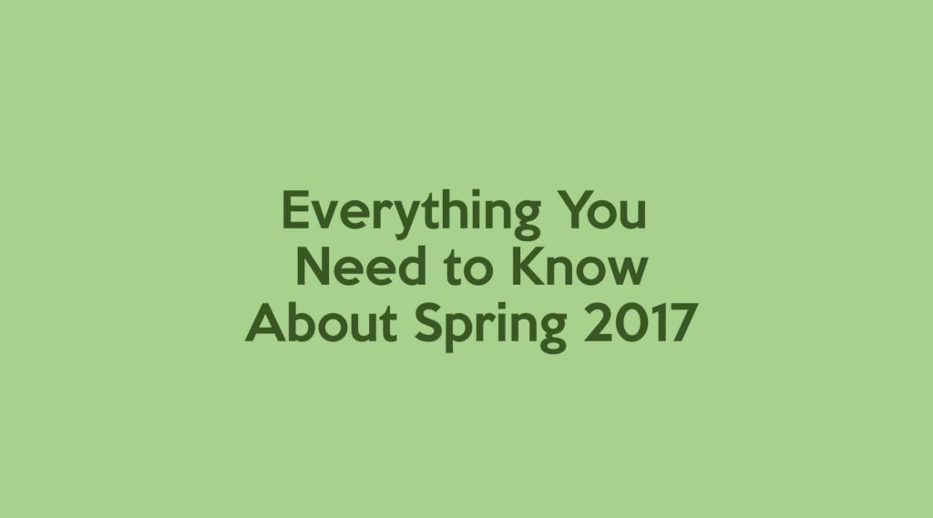 The countdown to the end of the year is on — and it’s filled with a HUGE amount of stuff to do. We’ve put together everything you need to know for Spring 2017 into one handy article. Let’s go: