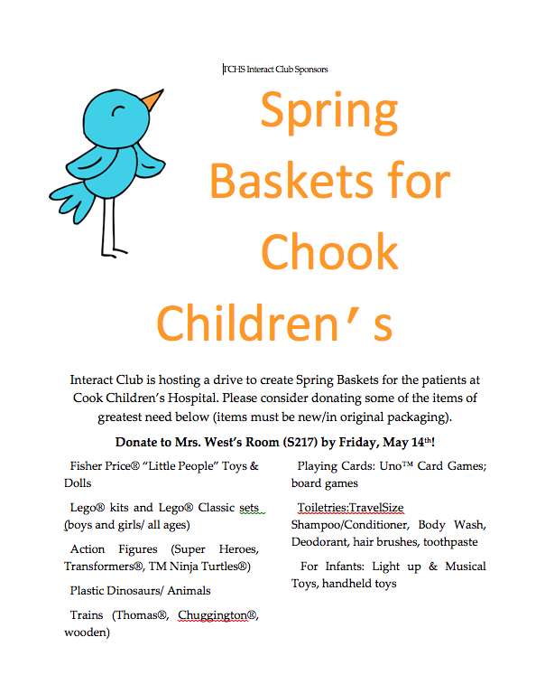 The Interact Club will be creating Spring Baskets for patients at Cook Children’s Hospital. They will be hosting a donation drive for certain items that Cook Children’s has designated as their highest needs. The supplies list includes toiletries, toys, board games, and more. Items donated most be new and in original packaging.