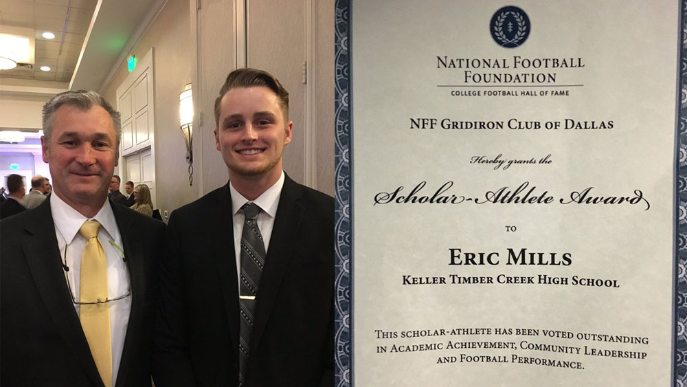 On April 3, Eric Mills, a senior wide receiver on the Timber Creek football team, was recognized as an area scholar/athlete by the National Football Foundation’s (NFF) Dallas Chapter. Mills was a captain of the team, two time All-District wide receiver, 1st team Academic All State, and in the top 15-percent of his class.