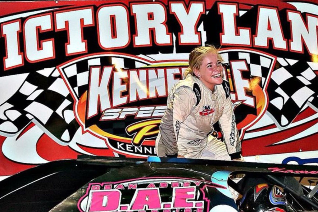 Her first car was received at the age of eight. She began racing because her dad and cousins raced and as she grew up watching them she very quickly wanted to be like them. Her car currently has many bright colors that are extremely eye-catching, sporting the number 62 with a K following to represent her name and the phrase, This Girl is on Fire, across the back.