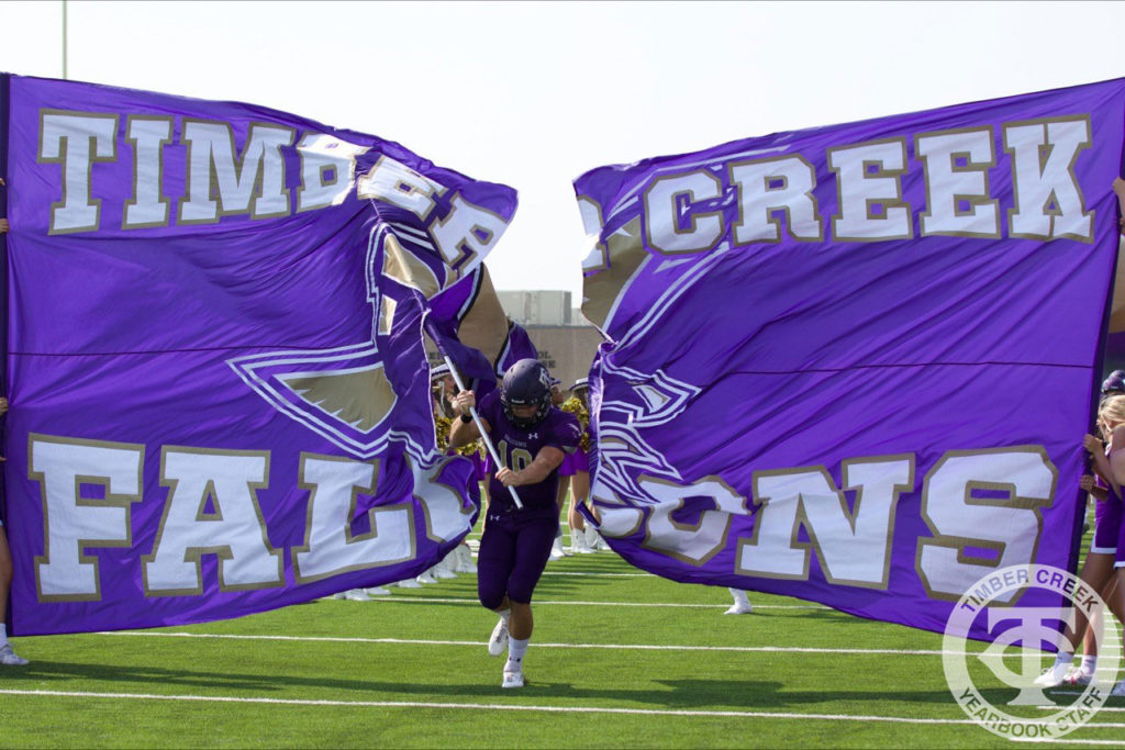 Timber Creek players bust through a banner before the Sept. 2, 2017 home opener. (Photo by Yearbook Editor Taylor Deker.)
