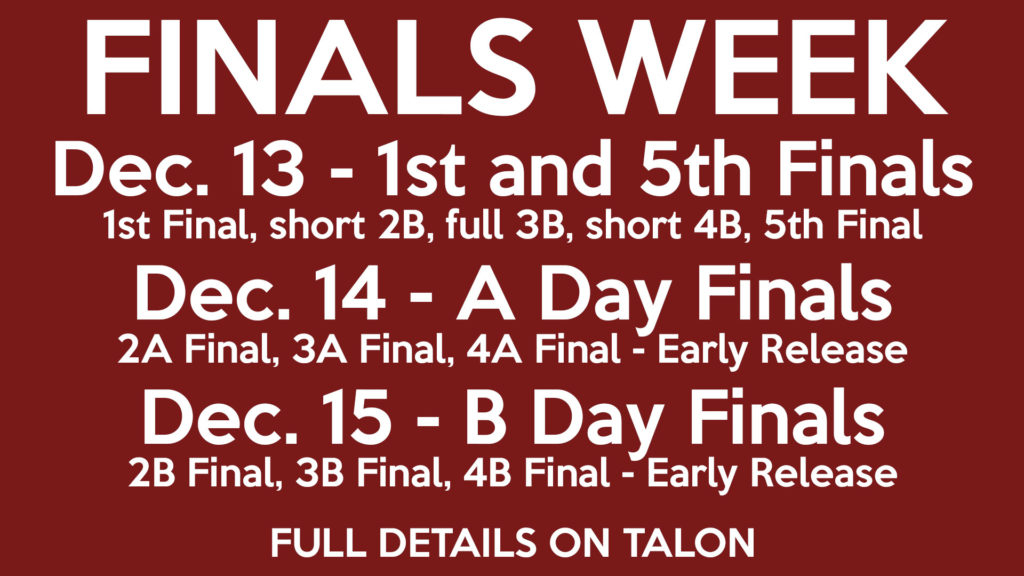 The 2017-18 schedule has shifted Fall semester finals to occur before the holiday break. Check out the dates, times, and periods that will be tested from Dec. 13-15, 2017.