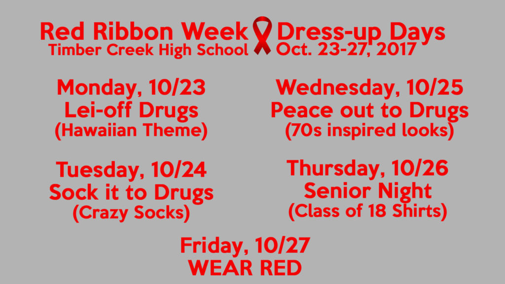 Timber Creek Student Council is celebrating Red Ribbon Week and urging students to understand the dangers of drugs and alcohol with interesting dress-up days for Oct. 23-27, 2017.