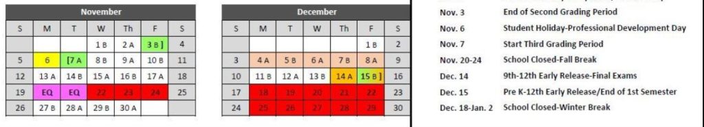 To round out the post-turkey break time, students have two full, regularly scheduled weeks of school before the week of Dec. 11. On that week, Monday, Dec. 11 and Tuesday, Dec. 12 are regular school days before final exams begin Dec. 13-15.