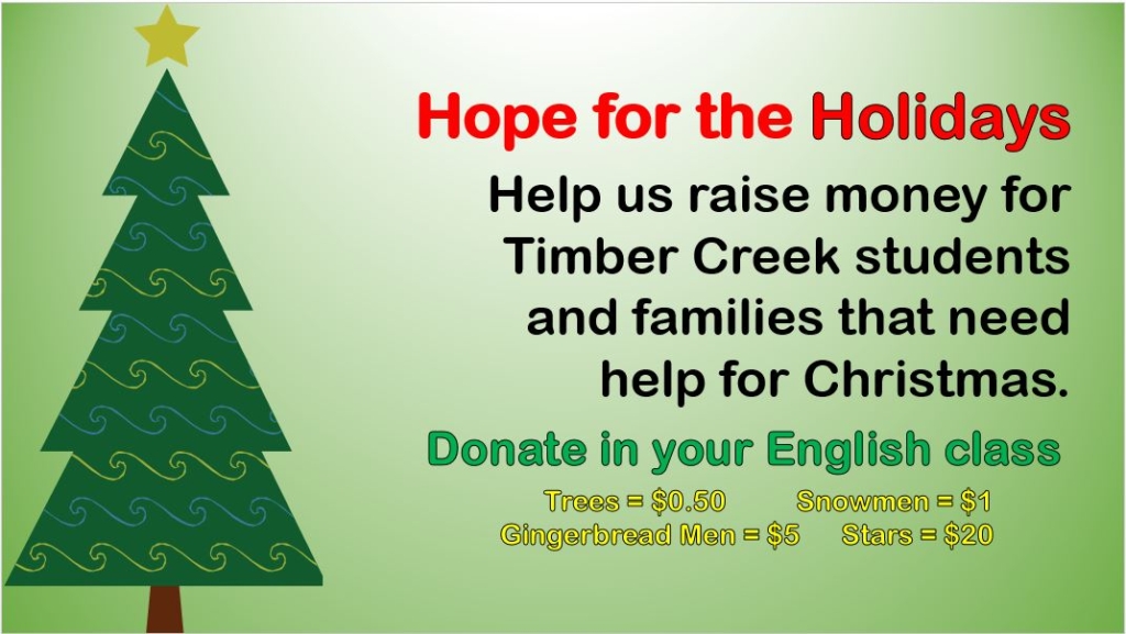Students will have a “Hope Tree” in their English class, and can purchase ornaments from their teacher to fill up the tree. Donation amounts will range from about 50 cents to $20 per item. The English teacher with the most donations will win a dessert party for all their classes.