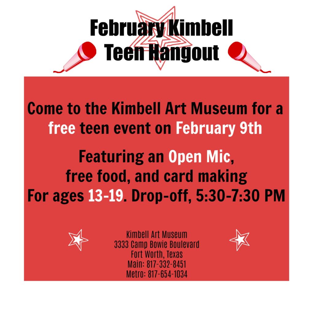 The Kimbell Art Museum is hosting a free Teen Hangout on Feb. 9. All 13-19 year olds are welcome.