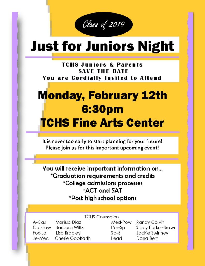 Juniors in the graduating class of 2019 and their parents have the opportunity to learn and receive information on the college application process and life after high school at the ‘Just for Juniors Night’ on Monday, Feb. 12. The event will begin at 6:30 p.m. to in the Fine Arts Center.