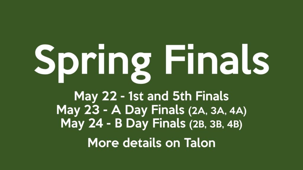 All spring finals will be on May 22-24. Both May 23 and May 24 will be early release days.