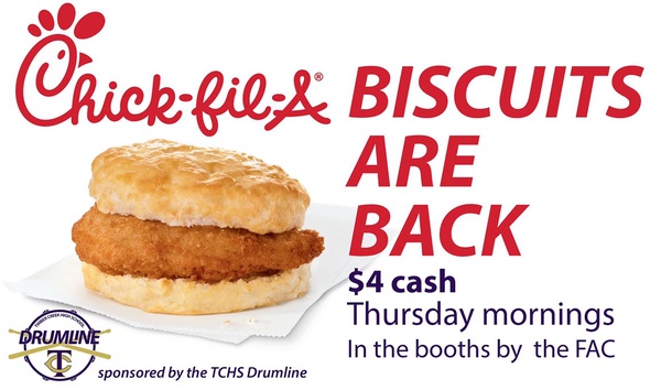 Timber Creek Drumline will be selling Chick-fil-a biscuits on Thursday mornings.