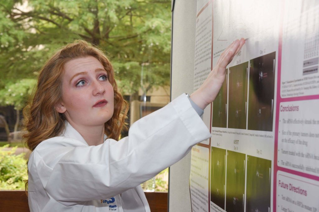 At the end of term, interns were expected to present posters of what they had accomplished and learned over their time on campus. Engebretson was so proud of hers, that she is hanging it on her wall, mouse-tumor MRI’s and all, color coordinating her room to match it.