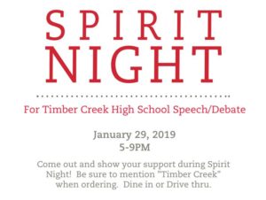 The Speech and Debate team will be holding a Spirit Night on Tuesday, Jan. 29 at Chick-fil-a from 5 p.m. to 9 p.m.