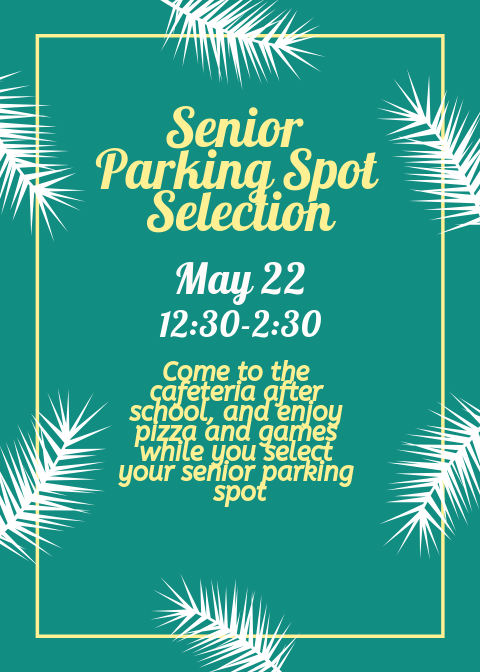 Current juniors will have the opportunity to select and purchase their senior parking spot on Wednesday, May 22 at 12:30 p.m. to 2:30 p.m. Parking spots are $100.