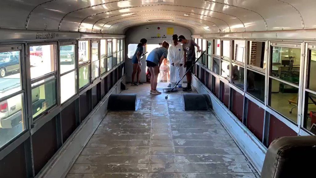 The team of students started by removing the bus seats, floors, and decals. The students also used tools to grind down the rust and installed insulation. As more students joined the project, classmates taught each other on how to use saws, heat guns, and nail guns to build and patch up the floors. Through this, students were able to experience real life situations that they’ll be able to apply in life.