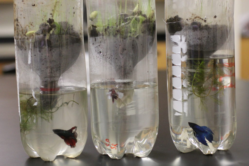 Soon after, students brought in their betta fish and put them in the water portion of the ecosystem, and put a cricket in the top half. Then they conducted tests on the water to determine levels of temperature, dissolved oxygen, carbon dioxide, pH, ammonia, nitrate, and nitrite. Seeds were placed in the soil to produce oxygen, necessary for the survival of the fish in the sealed container.
