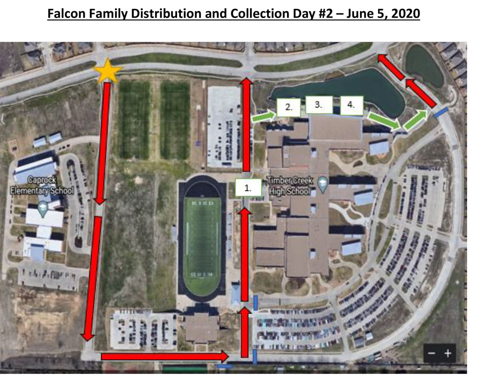 Like the Mid-May distribution, vehicles should enter at Grey Twig Drive (by Caprock Elementary) and proceed in the traffic map shown below. However, unlike the May pick up, vehicles will travel in a slightly different direction to head to the front of the building for distribution and pick up.