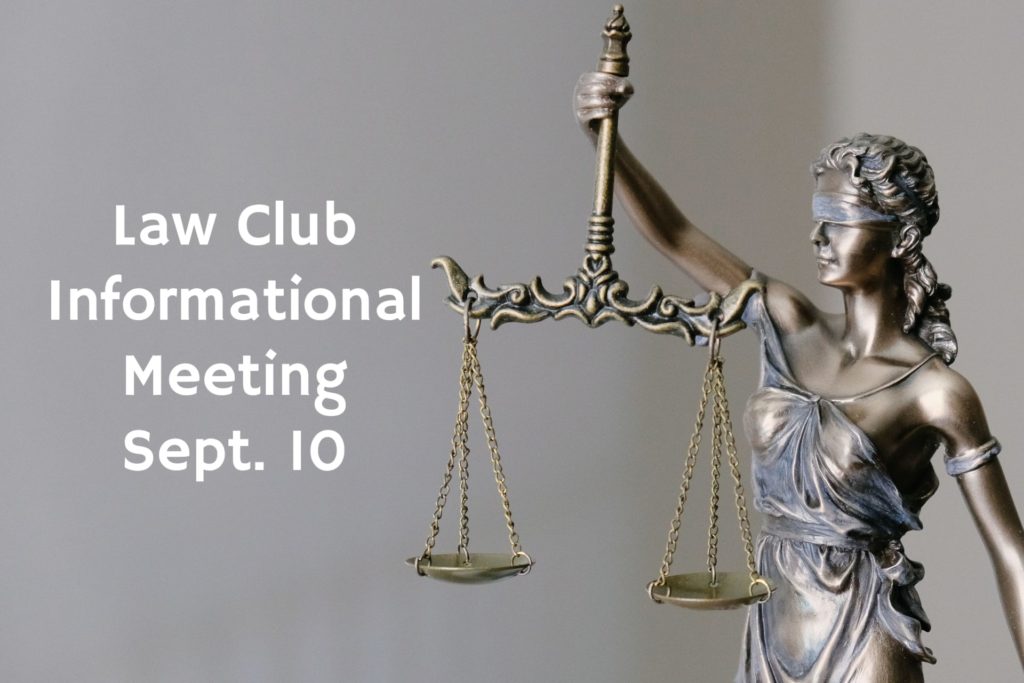 The Law Club will be holding an informational meeting on Thursday, Sept. 10 from 5-6 p.m. on Zoom. Students who are interested in joining need to fill out this form bit.ly/lawclub or check out their newsletter here to get all the information for the meeting.