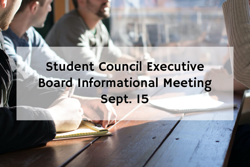 Student Council will be holding an informational meeting for potential Executive Board meetings. This meeting is for Students who are interested in applying or have already applied. The meeting will take place over Zoom on Sept. 15 at 4:30 p.m. to provide more information.