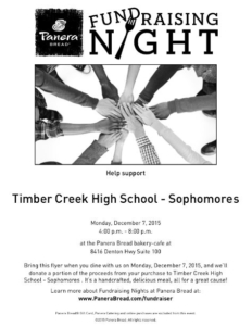 The next spirit night for the sophomore class will be held on Monday, Dec. 7 from 4-8 p.m. at Panera Bread off 377.