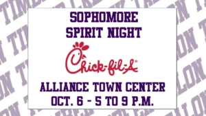 Sophomore class spirit night will take place on Oct. 6 at the Chick-Fil-A in Alliance Town Center.