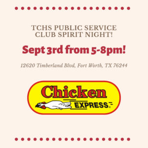 The Public Service club is hosting their first spirit night on Sept. 3 from 5 p.m. to 8 p.m. It will be held at Chicken Express on Timberland Blvd, to raise money for new equipment, uniforms, competitions, transportation, and more.