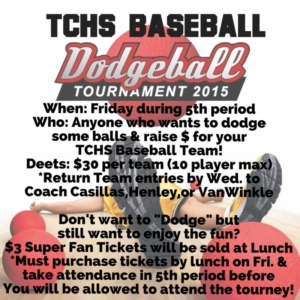 Timber Creek Baseball is hosting a dodgeball tournament on Friday, Dec. 4 during 5th Period.